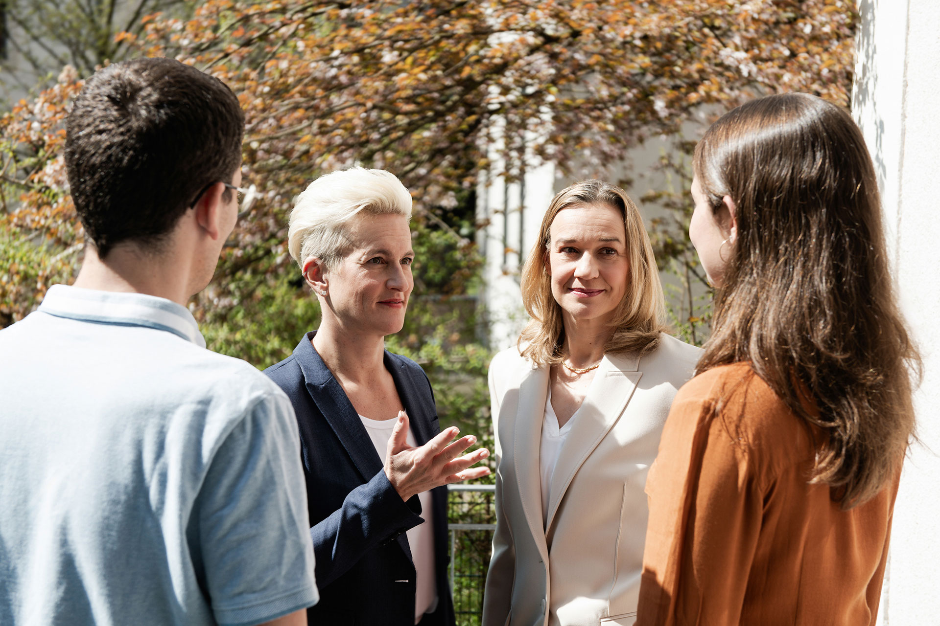 Porträt Karin Schuster, Ansprechpartnerin für Cross Mentoring und Personalentwicklung bei Cross Consult, im Gespräch mit Teilnehmenden.